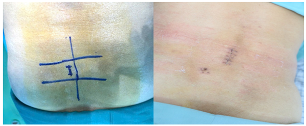 Vị trí đường mổ và vết mổ của người bệnh Hà Thị Toản.