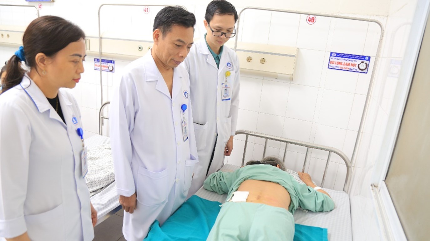 PGS.TS Nguyễn Văn Sơn kiểm tra vết mổ cho người bệnh Hà Thị Toản.