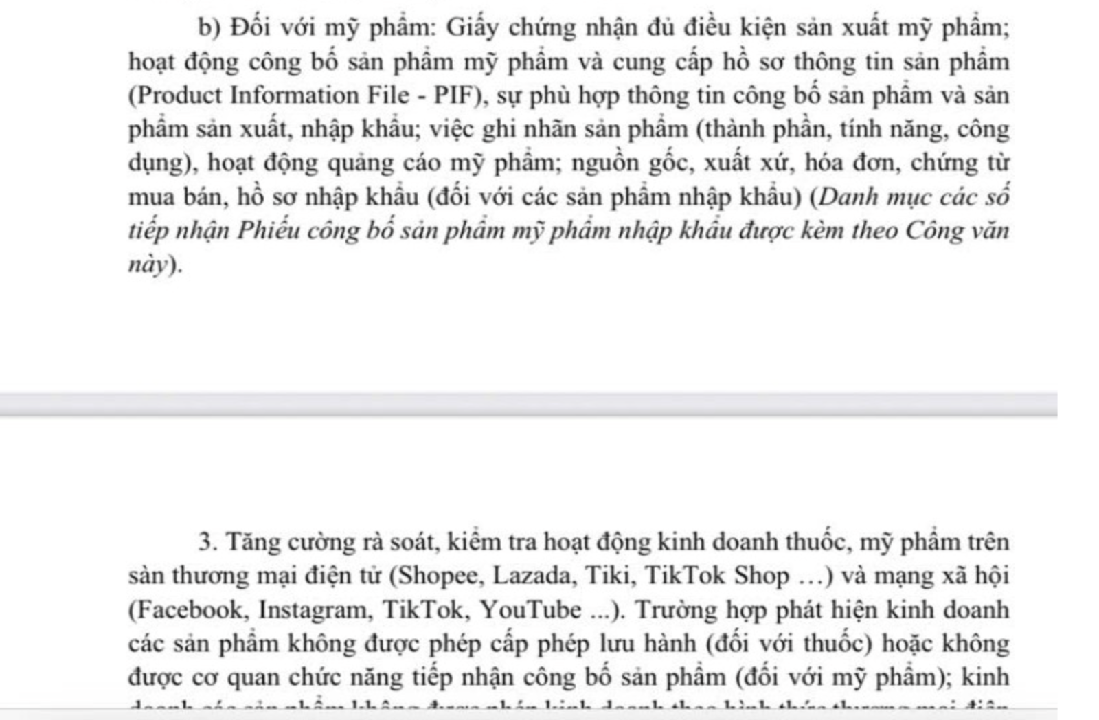Trường hợp phát hiện kinh doanh các sản phẩm không được phép cấp phép lưu hành (đối với thuốc) hoặc không được cơ quan chức năng tiếp nhận công bố sản phẩm (đối với mỹ phẩm); kinh doanh các sản phẩm không được phép kinh doanh theo hình thức thương mại điện tử; kinh doanh các sản phẩm đã có thông báo thu hồi, tiêu hủy của các cơ quan chức năng; quảng cáo các sản phẩm vi phạm quy định về quảng cáo, cần kịp thời xử lý và phản ánh về Bộ Công Thương; Bộ Văn hóa, Thể thao và Du lịch; Bộ Khoa học và Công nghệ; Bộ Y tế để phối hợp giải quyết.