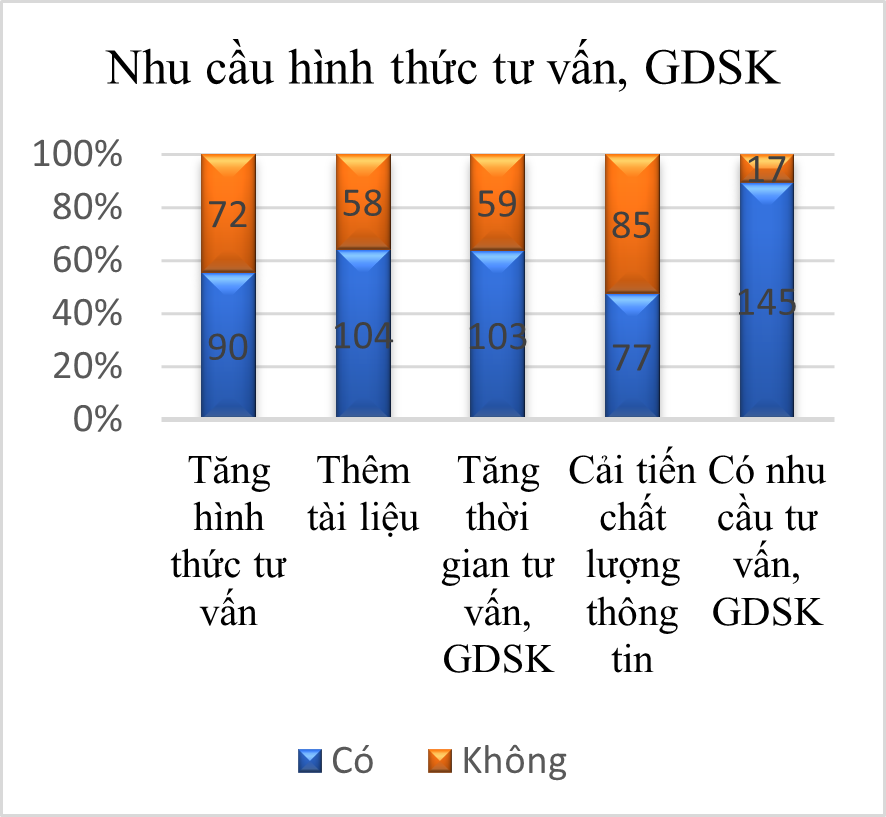 Đáng chú ý, 90% người bệnh bày tỏ nhu cầu được TV và GDSK, phản ánh khoảng trống về kiến thức và sự mong đợi cao từ phía người bệnh. Kết quả này tương đồng với nghiên cứu của Nguyễn Thị Phượng, trong đó hơn 85% người bệnh ĐTĐ2 mong muốn được NVYT tư vấn thường xuyên về chế độ ăn, luyện tập và sử dụng thuốc [3]. Bên cạnh đó, hơn 60% người bệnh đề xuất bổ sung tài liệu và đa dạng hóa hình thức truyền thông như sách, tờ rơi, video và hình ảnh, cho thấy nhu cầu được hỗ trợ qua nhiều kênh. Đặc biệt, 70% mong muốn được tư vấn về điều trị và biến chứng, phản ánh sự quan tâm thiết thực đến tình trạng bệnh và hậu quả lâu dài.