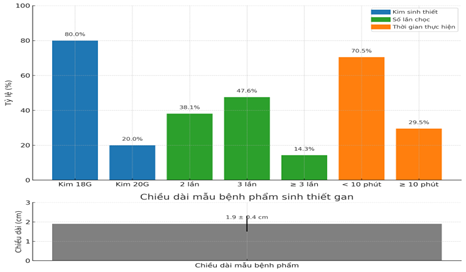 Đa số thủ thuật dùng kim 18G (80%), còn 20G chiếm 20%. Số lần chọc phổ biến nhất là 3 lần (47.6%), kế đến 2 lần (38.1%) và ≥ 3 lần chiếm 14.3%. Thời gian thực hiện chủ yếu < 10 phút (70.5%), chỉ 29.5% ≥ 10 phút. Chiều dài mẫu mô trung bình 1.9 ± 0.4 cm, hầu hết đạt yêu cầu chẩn đoán