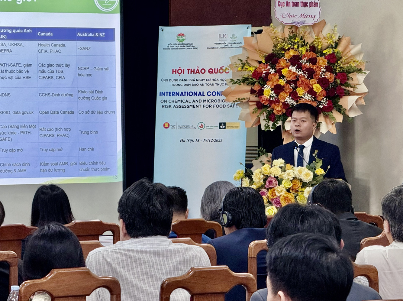 Ngày 18/12, Viện Kiểm nghiệm an toàn vệ sinh thực phẩm Quốc gia phối hợp với Viện Nghiên cứu Chăn nuôi Quốc tế (ILRI) tổ chức Hội thảo quốc tế “Ứng dụng đánh giá nguy cơ hóa học và vi sinh trong đảm bảo an toàn thực phẩm”. Sự kiện thu hút sự tham gia của nhiều nhà quản lý, nhà khoa học trong và ngoài nước, tập trung chia sẻ các phương pháp, mô hình và kinh nghiệm thực tiễn trong đánh giá nguy cơ an toàn thực phẩm.