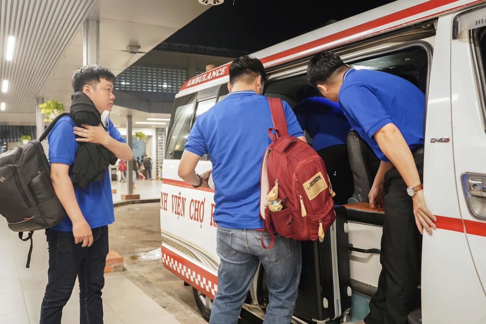 Đoàn công tác Bệnh viện Chợ Rẫy gồm ThS.BSCKI Nguyễn Phúc Huy - Khoa Chấn thương chỉnh hình, BSCKI Lý Thành Kiệt - Khoa Hồi sức cấp cứu, BS Bùi Đức Anh Tuấn - Khoa Hồi sức tích cực khu D, cùng 3 cử nhân điều dưỡng các Khoa Phẫu thuật Gây mê hồi sức và Khoa Cấp cứu.