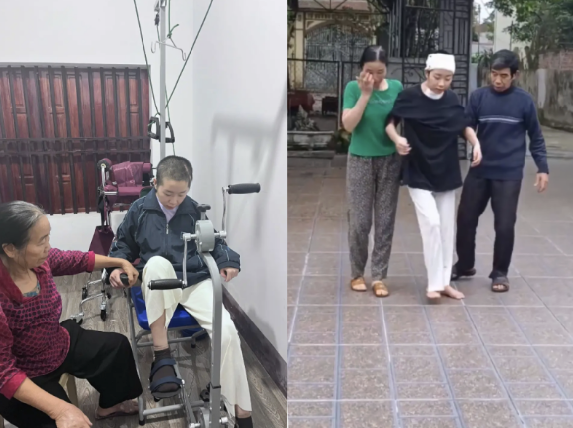 “Đến ngày 7/2, mình được chuyển về bệnh viện ở Thanh Hóa. Đây là lúc mình mới bắt đầu có nhận thức và phản xạ khi được mọi người nói chuyện hoặc gọi tên. Sau đó mình tập thở bằng canuyn, ngay cả việc hít thở cũng rất khó khăn, mỗi lần tập thở lâu nhất mình chỉ được khoảng 2 tiếng. Tháng 3, mình tiếp tục được chuyển ra Bệnh viện Tâm Anh để chuẩn bị ghép sọ. Tuy nhiên, do sức khỏe không đảm bảo vì nhiễm khuẩn và sốt kéo dài nên mình phải hoãn lịch ghép để điều trị. Khi tình trạng ổn định hơn, mình được cho về quê chờ ngày phẫu thuật.