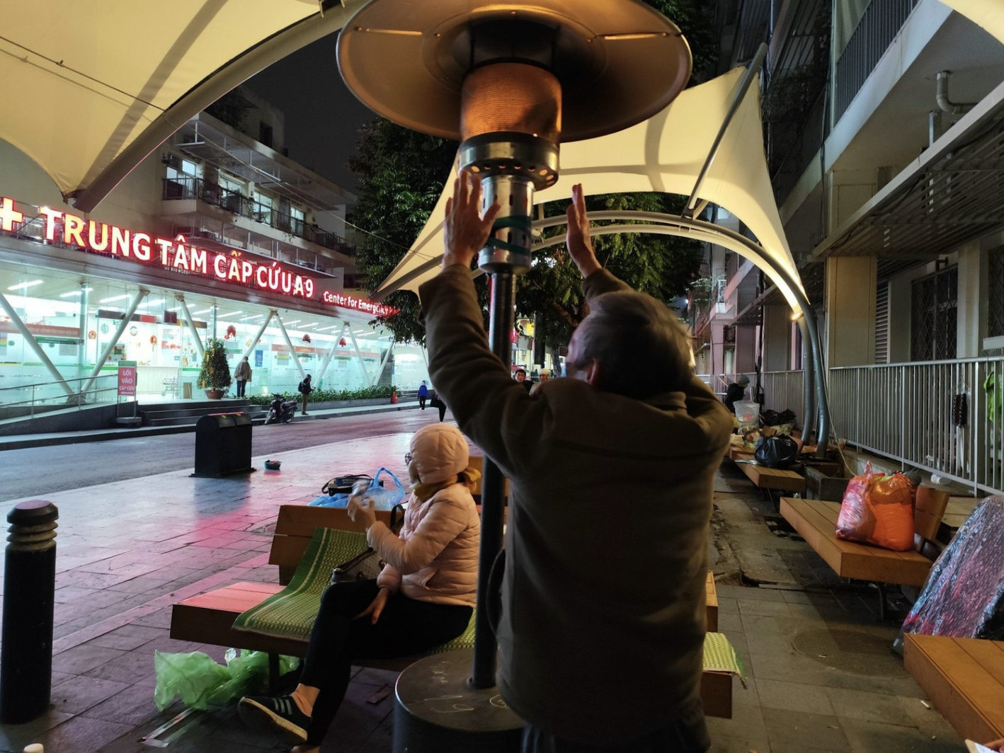 Người nhà bệnh nhân sưởi ấm qua các cây sưởi gas di động trong thời tiết giá rét.