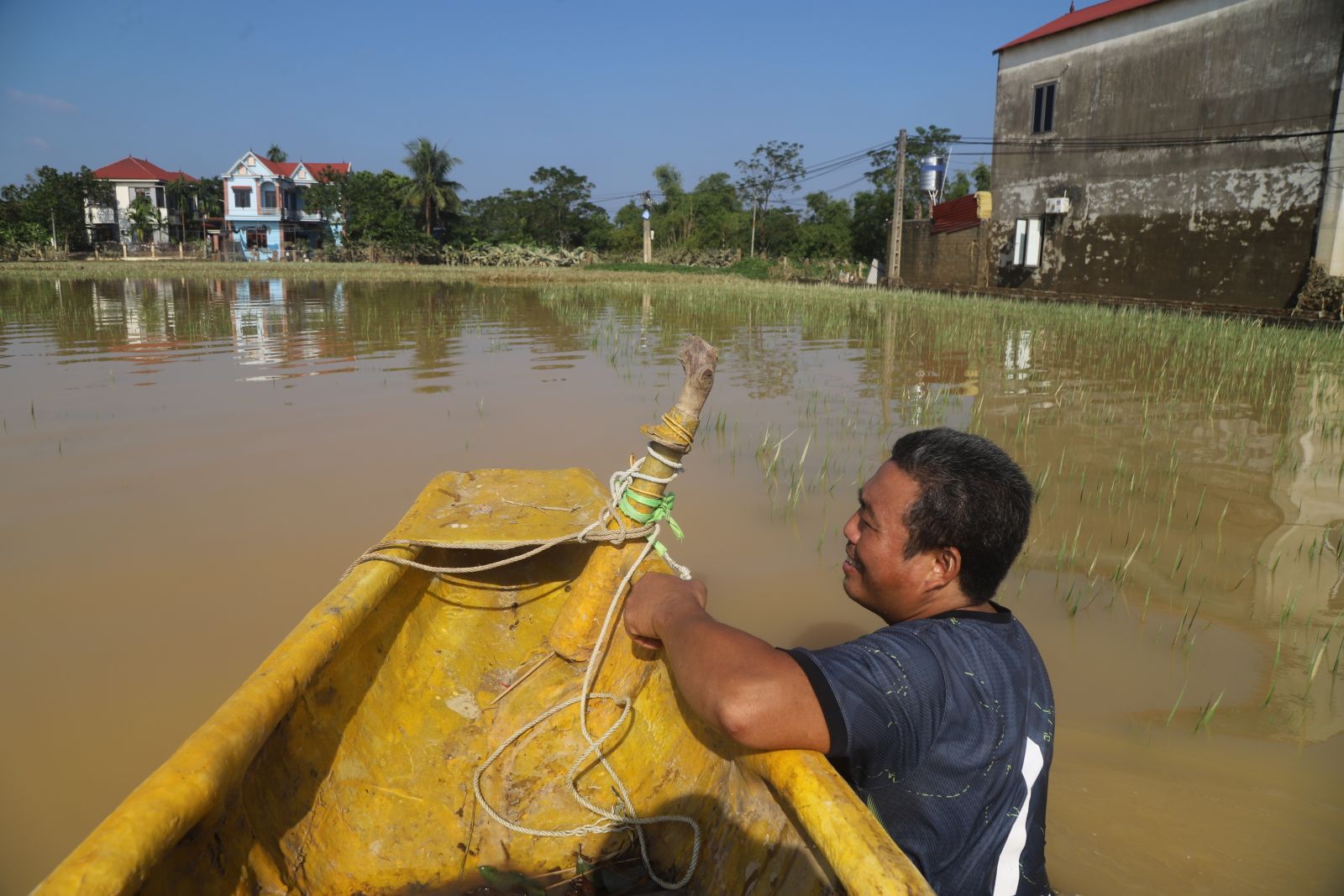 Người đàn ông hàng ngày chèo đò đưa các đoàn cứu trợ đến từng hộ dân trong xóm. Ảnh: LT.