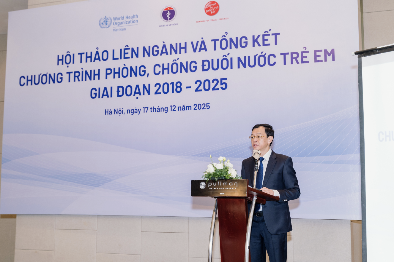 Thông tin được PGS.TS.BSCKII Nguyễn Tri Thức – Thứ trưởng Bộ Y tế nhấn mạnh tại Hội thảo liên ngành và Tổng kết Chương trình Phòng, chống đuối nước trẻ em giai đoạn 2018–2025, do Bộ Y tế phối hợp với Tổ chức Y tế Thế giới (WHO) và tổ chức Campaign for Tobacco Free Kids (CTFK) tổ chức tại Hà Nội ngày 17/12.