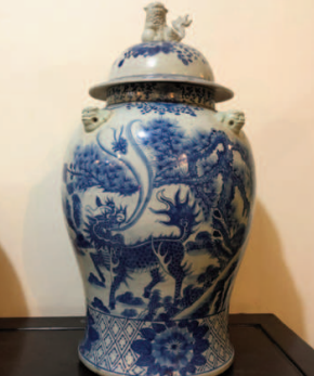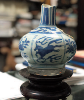 Long Mã nhả kinh thư, do nghệ nhân người Hoa họa trên chóe sứ đời Trung Thanh, thuộc dòng gốm Vạn Ninh, hiện nằm trong bộ sưu tập đồ cổ của tác giả.