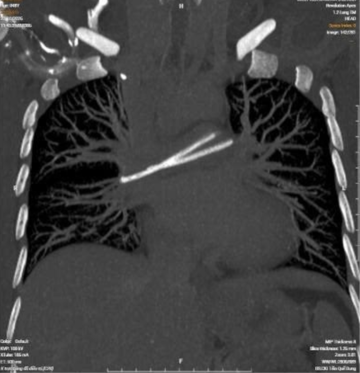 Bước ngoặt xảy ra khi bệnh nhân đi khám tầm soát tại một cơ sở y tế tư nhân. Kết quả CT ngực có tiêm thuốc cản quang khiến bác sĩ bất ngờ: một dị vật dạng ống nằm trong tim, vắt ngang vùng động mạch phổi hai bên.