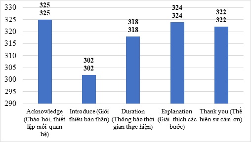 The study results demonstrate a high level of adherence to the AIDET communication model at Vinmec Smart City Hospital, with 91.7% of total observations successfully fulfilling all five stages. Notably, the components of Acknowledge, Explanation, and Thank You exhibited exceptional compliance rates of 99.7%, 99.4%, and 98.8%, respectively. In contrast, the Introduce step was identified as the least performed component, with a rate of 92.6%.