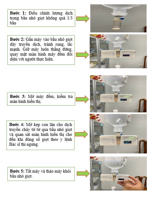 - Qua quá trình giám sát các khoa thực hiện quy trình truyền dịch nhận thấy khối lượng công việc của điều dưỡng tương đối nhiều, đặt biệt thao tác điều chỉnh số giọt bằng đồng hồ tốn nhiều thời gian và độ chính xác chưa cao nên vẫn còn tiềm ẩn nguy cơ trên người bệnh. Qua đó, máy đếm số giọt dịch truyền khắc phục được các hạn chế trên, máy có độ chính xác cao (98%), rút ngắn thời gian đếm ra kết quả nhanh (trong 4 giọt hiển thị kết quả).