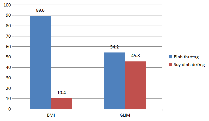 Người bệnh được đánh giá tình trang dinh dưỡng theo BMI dựa trên tiêu chuẩn của Tổ chức Y tế thế giới WHO: BMI ≥ 25,0: thừa cân/ béo phì; 18,5 ≤ BMI ≤ 24,99: bình thường; BMI <18,5: thiếu năng lượng trường diễn. Đánh giá tình trạng dinh dưỡng theo tiêu chuẩn GLIM 2018: Suy dinh dưỡng vừa, suy dinh dưỡng nặng. Thiếu máu theo giá trị hematocrit <130g/l được coi là thiếu máu.