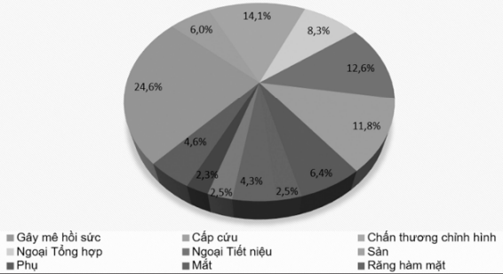 Về phân bố khoa phòng: Do PT tại Phòng mổ nên NVYT khoa Gây mê chiếm tỉ lệ lớn nhất, chủ yếu là điều dưỡng tham gia phục vụ các PT. Tiếp đến là các khoa Ngoại: Chấn thương chỉnh hình, Tiết niệu, Sản, Tổng hợp, Phụ... và các khoa chuyên khoa lẻ: Mắt, TMH, RHM, Thẩm mỹ....
