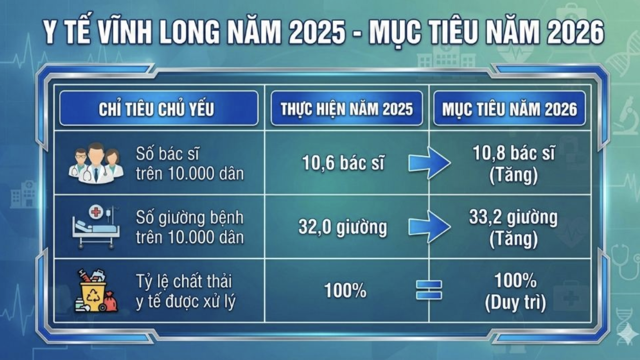 Vĩnh Long hiện đạt 10,6 bác sĩ trên một vạn dân, tạo nền tảng nâng cao chất lượng khám chữa bệnh và hướng tới mục tiêu 10,8 bác sĩ/vạn dân vào năm 2026.